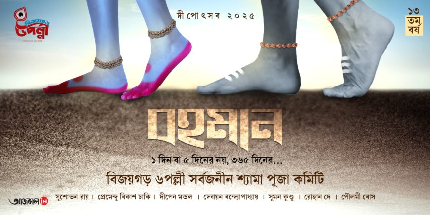 রবীন্দ্রনাথ ঠাকুর লিখেছিলেন, “ঘড়ির কাঁটায় বাঁধা জীবনে, হৃদয়ের সুর হারিয়ে যায়।” এই হারিয়ে যাওয়া সুরই আজ আমাদের জীবনের প্রতিধ্বনি হয়ে ফিরে আসে। আমরা কাজের চাপে, লক্ষ্যপূরণের দৌড়ে, সমাজের প্রত্যাশার ভারে এতটাই ব্যস্ত যে হৃদয়ের মৃদু সঙ্গীত আর শোনা যায় না। সময় আমাদের বেঁধে ফেলেছে এক অদৃশ্য শৃঙ্খলে, যেখানে আত্মার স্বাধীনতা যেন হারিয়ে গিয়েছে। সেই ধারণাকেই এবছর নিজেদের মণ্ডপে ফুটিয়ে তুলতে চলেছে বিজয়গড় ৬ পল্লীর সর্বজনীন শ্যামা পুজো কমিটি। ১৩তম বর্ষে তাদের উদ্যোগ ‘বহমান’। পুজোটির ডিজিটাল মিডিয়া পার্টনার আজকাল ডট ইন।